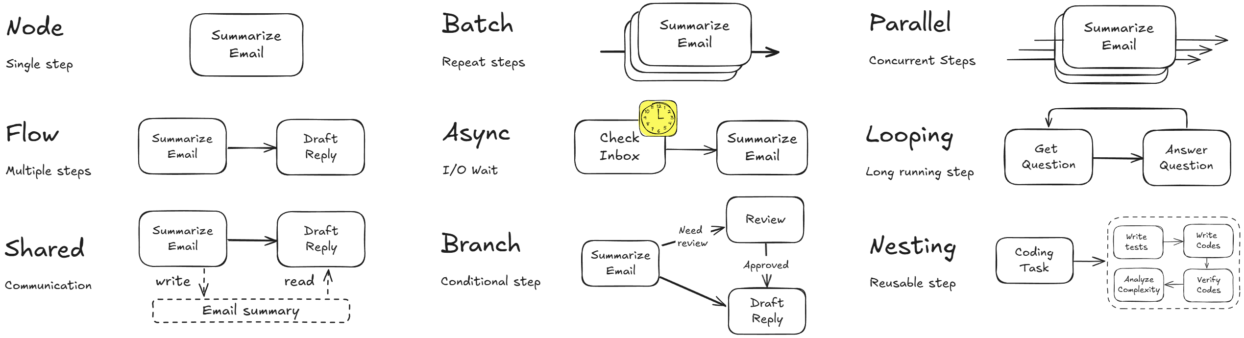 From there, it's easy to implement popular design patterns like ([Multi-](https://the-pocket.github.io/PocketFlow/design_pattern/multi_agent.html))[Agents](https://the-pocket.github.io/PocketFlow/design_pattern/agent.html), [Workflow](https://the-pocket.github.io/PocketFlow/design_pattern/workflow.html), [RAG](https://the-pocket.github.io/PocketFlow/design_pattern/rag.html), etc.