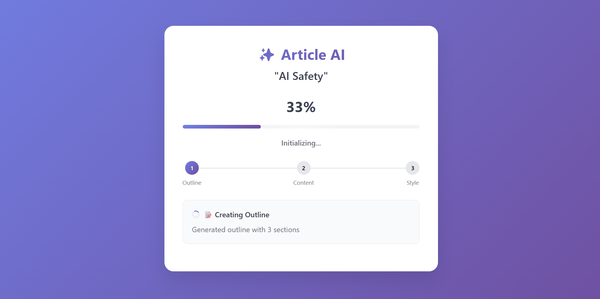main.py: FastAPI application with background jobs and SSE endpointsflow.py: PocketFlow workflow definition connecting the three nodesnodes.py: Workflow nodes (GenerateOutline, WriteContent BatchNode, ApplyStyle)utils/call_llm.py: OpenAI LLM utility functionstatic/index.html: Modern job submission form with topic suggestionsstatic/progress.html: Real-time progress monitoring with animations